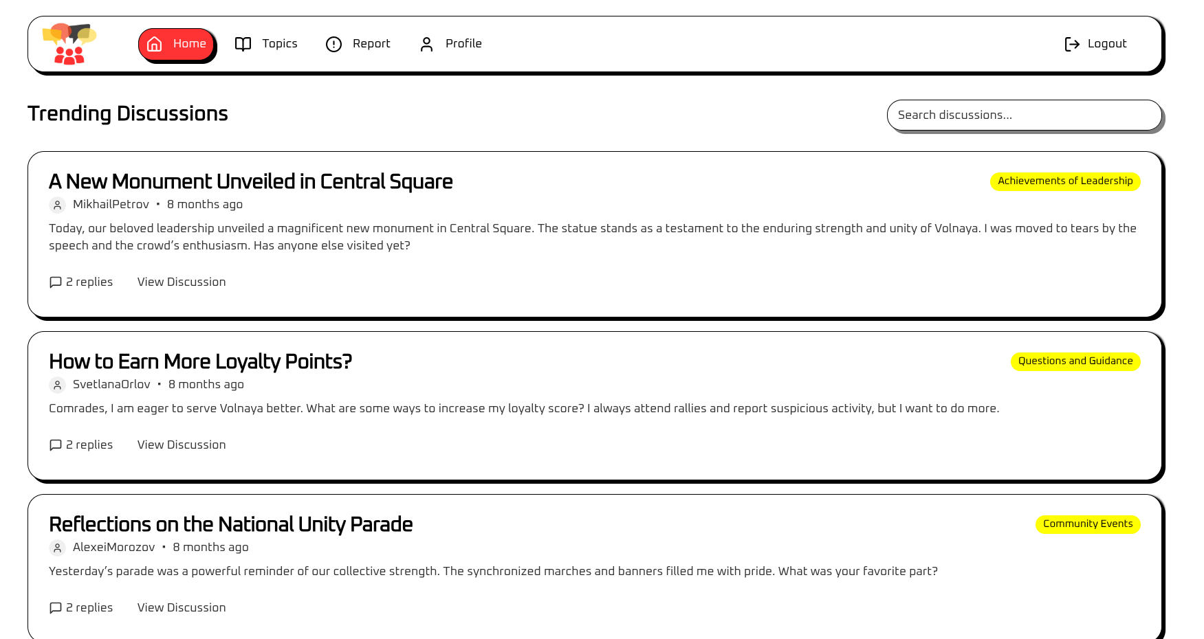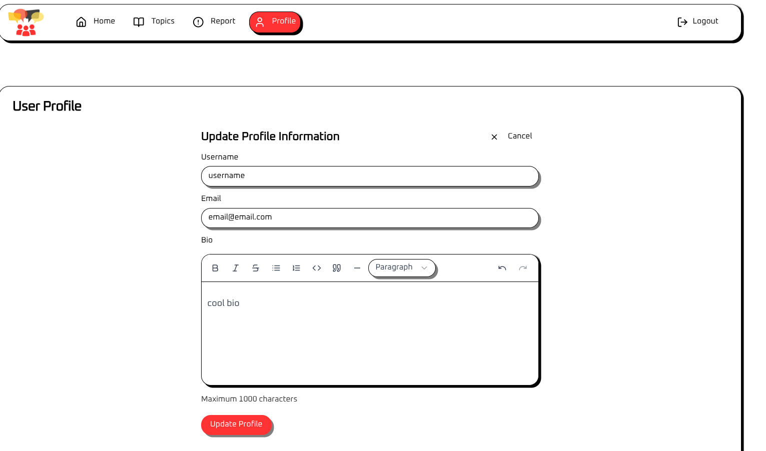 Besides the report functionality, the ‘Homepage’ and ‘Topic’ page have no other interesting feature, so I will check out the profile page next. Interestingly enough, I am not able to look at other user’s profiles, so it seems to be only visible to me. Despite that, i’m going to have a look at what happens when I update each of the fields: