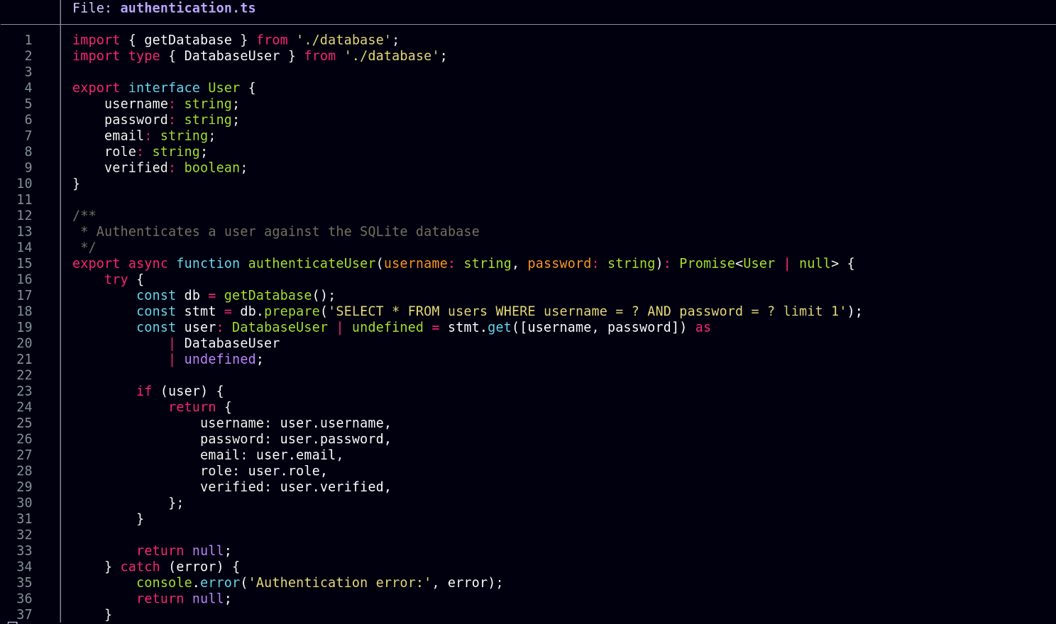 Evidently the isAuthenticated function checks whether the user is authenticated so I have a look to see how it’s structured, but unfortunately it seems to be built keeping SQL injection vulnerabilities in mind: