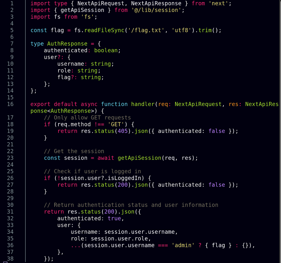 I took a look at the /api/auth.ts endpoint and see that in order to solve this lab, we need to make a request to this endpoint with an admin account.