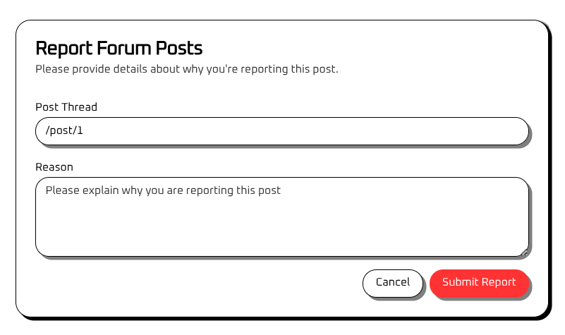 Besides that, there is also a report functionality which an unverified user has access to, after submitting a report I am notified that it has been reported to the moderators. Based on previous lab experience I am guessing there is some sort of bot set up in the background that will checkout the URL provided in the ‘Post Thread’ field (potentially with elavated privileges), so i’m keeping this in mind.