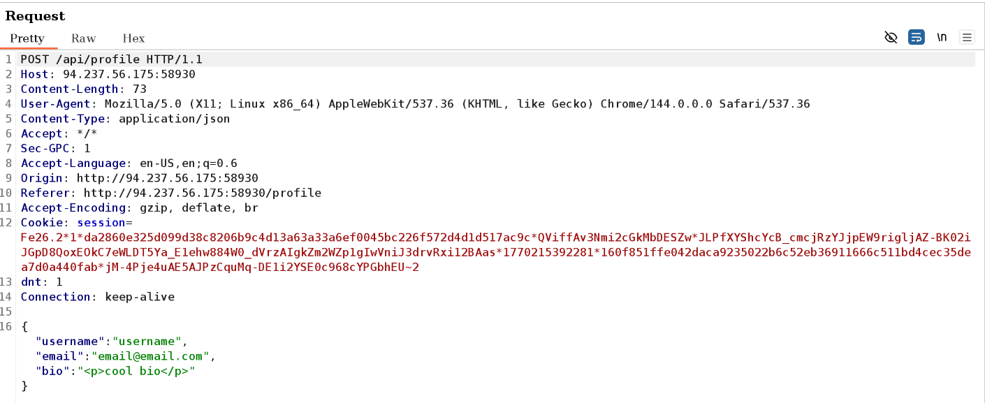 For one, the user seems to be authenticated using a session token. Secondly, the request reaches /api/profile (will checkout code next), and lastly, the bio field sends along a html p tag.